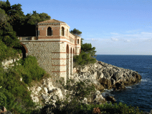The tip is really the start of the “Sentier des Douaniers” (sounds nice in French but which actually translates less romantically as the “Footpath of the Customs Officers”) – fortunately this is also known as the Sentier Le Corbusier, named after the legendary Swiss-born architect, famed for his minimalist modern styles, who lived here until his death in 1965 and is buried in the village of Cap Martin. The path winds its way along the coast, offering fine views of the skyscrapers of Monte Carlo, the older buildings of Monaco Ville as well as hang-gliders diving from the mountains and landing on the beaches if they are lucky or the sea otherwise… If you’re interested in the amazing views offered by this, see the site of the local hang-gliding club. Various very secluded luxury villas with amazing views can be spotted if you are able to take your eyes off the water views and look upwards: the building pictured here is just the “seaside lodge” of the huge residence located on top of the hill and hidden away by rather impressive gardens!